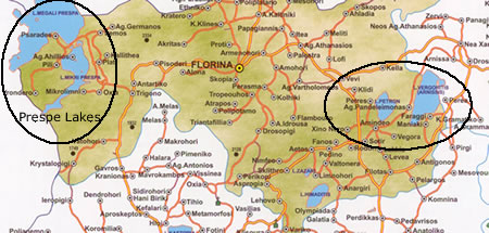 These are southeast of Florina, near Amindeo, and are known for their birdlife. They are natural lakes which lie about 500 meters above sea level, with hills or mountains around them. As of a few years ago they were being considered for designation as Special Areas for Conservation. Lake Vegoritidha is the largest and deepest of the two.